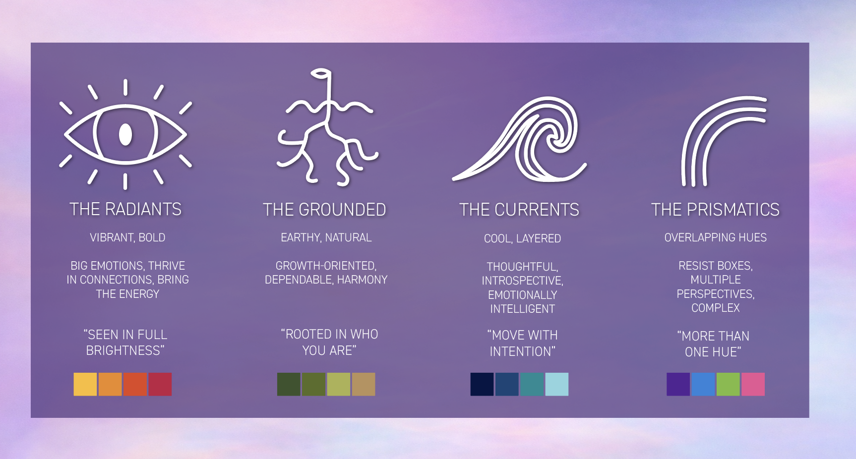 After they complete the exhibit, visitors will be assigned their color identity and be placed into one of four groups; The Radiants, The Grounded, The Currents, or The Prismatics.